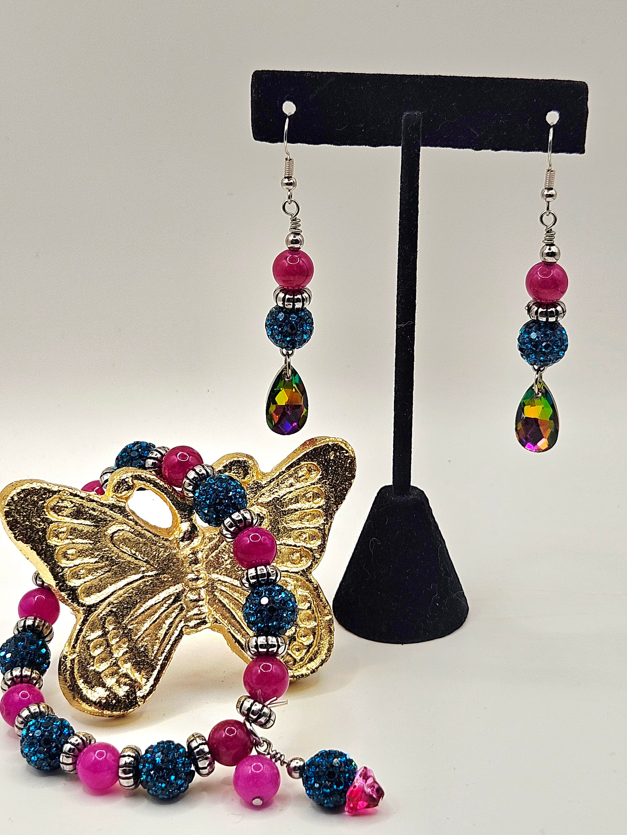 Bracelet and earring set made with Malaysia Jade (dyed quartz ) cut-glass crystal teardrop and rhinestone round beads and the bracelet is made with stretch cord