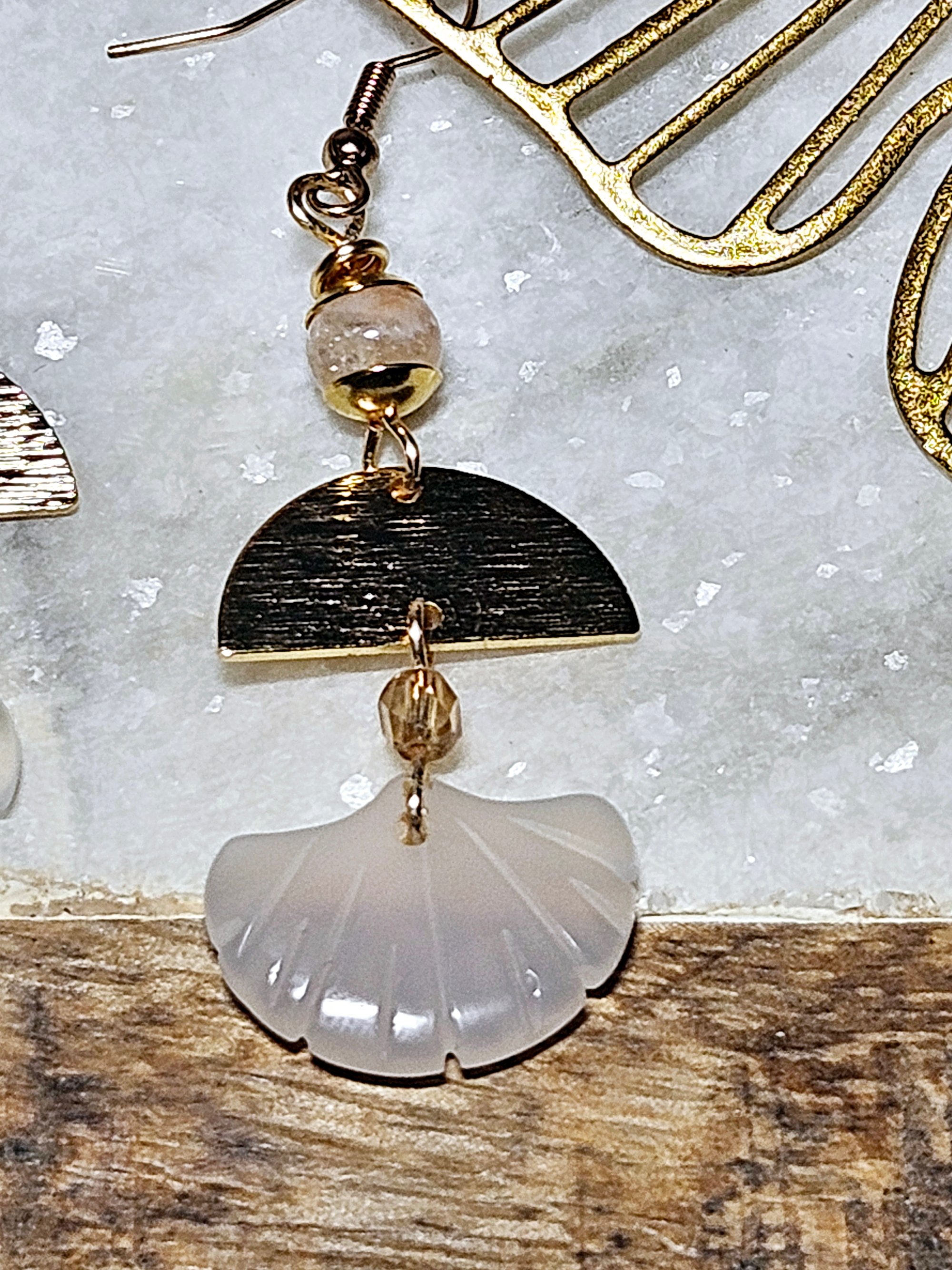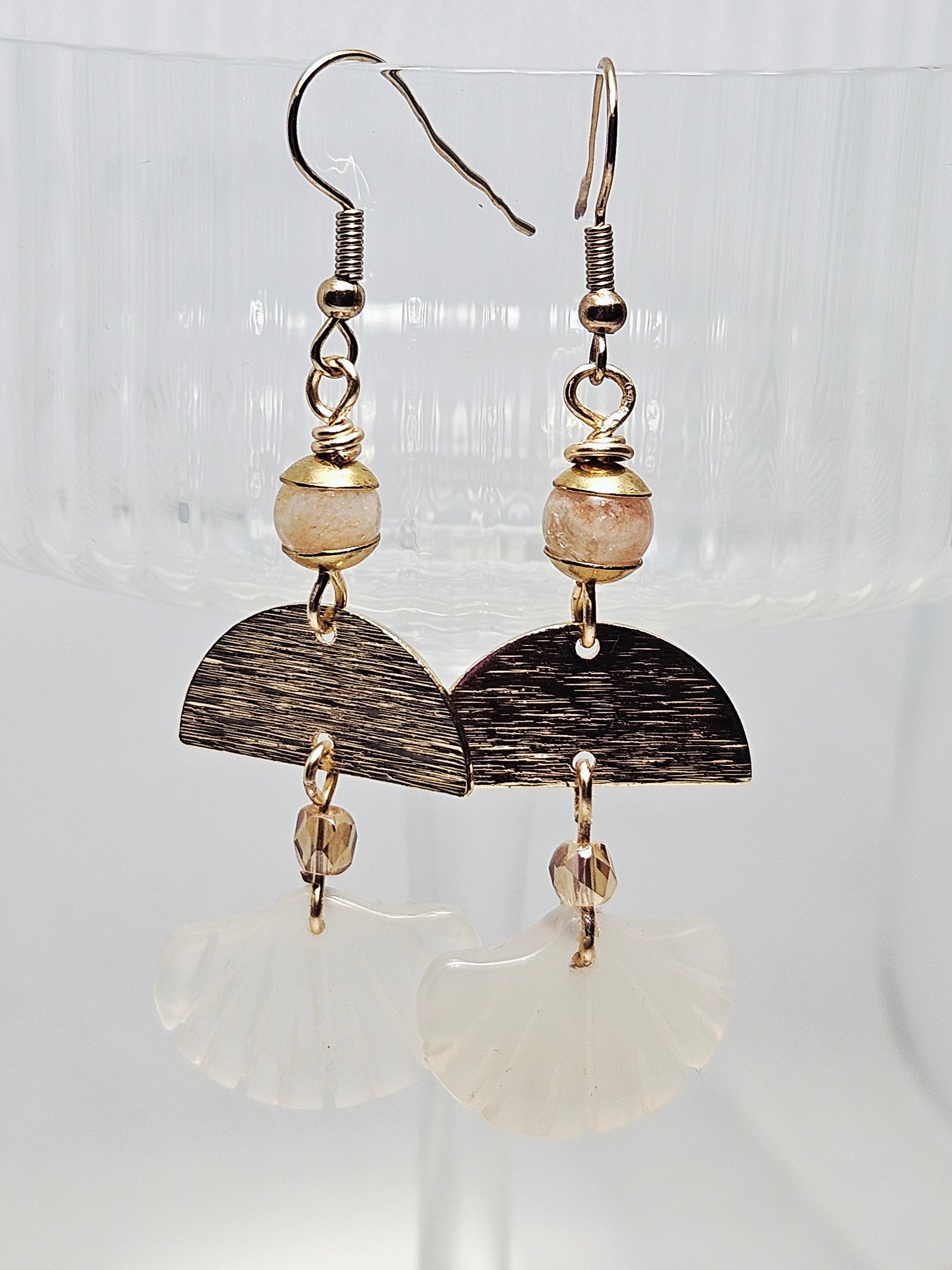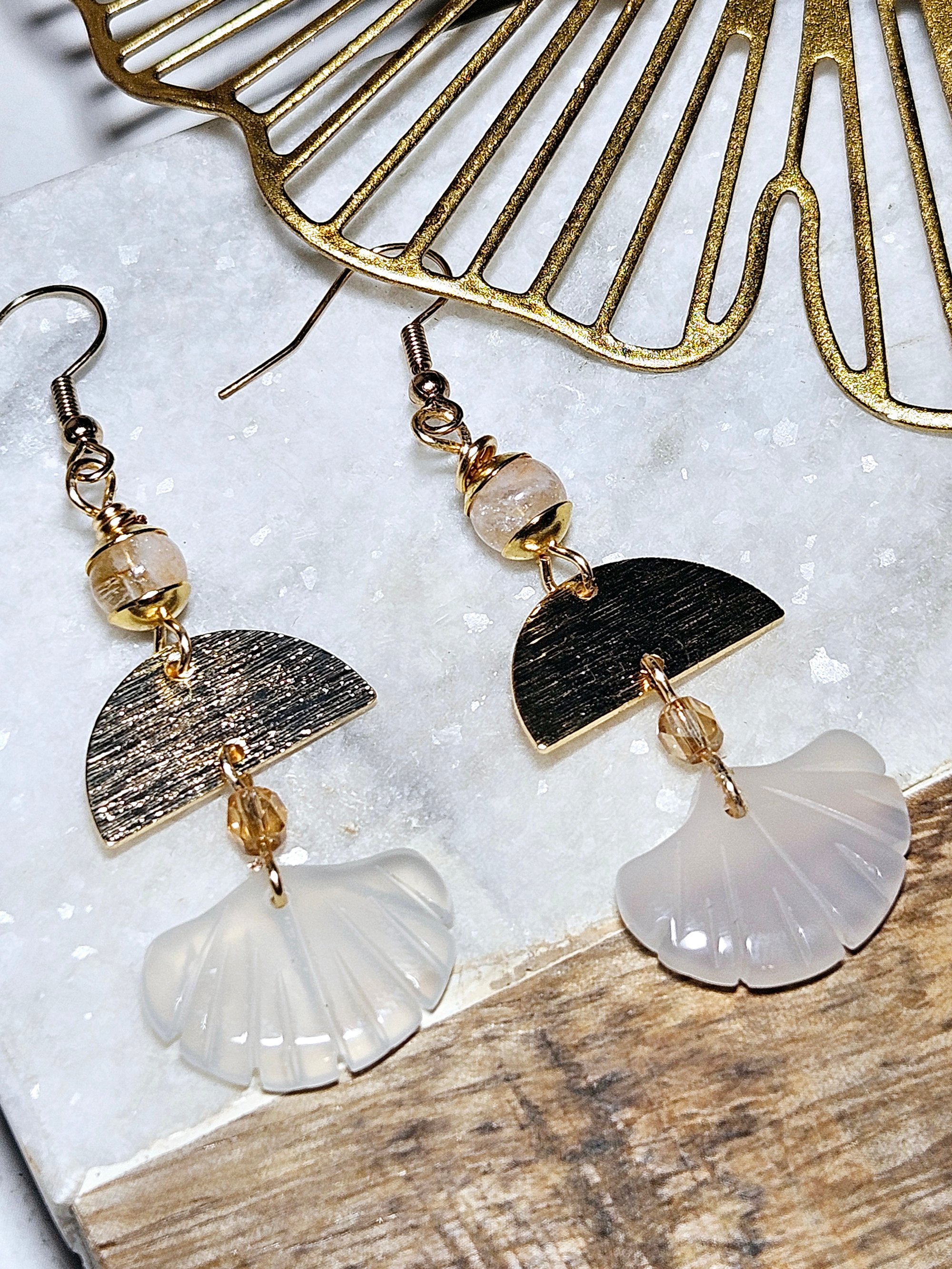 Stainless steel beadcaps with 18k gold plated brass half circle pendant and a craved white agate ginkgo leaf charm