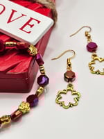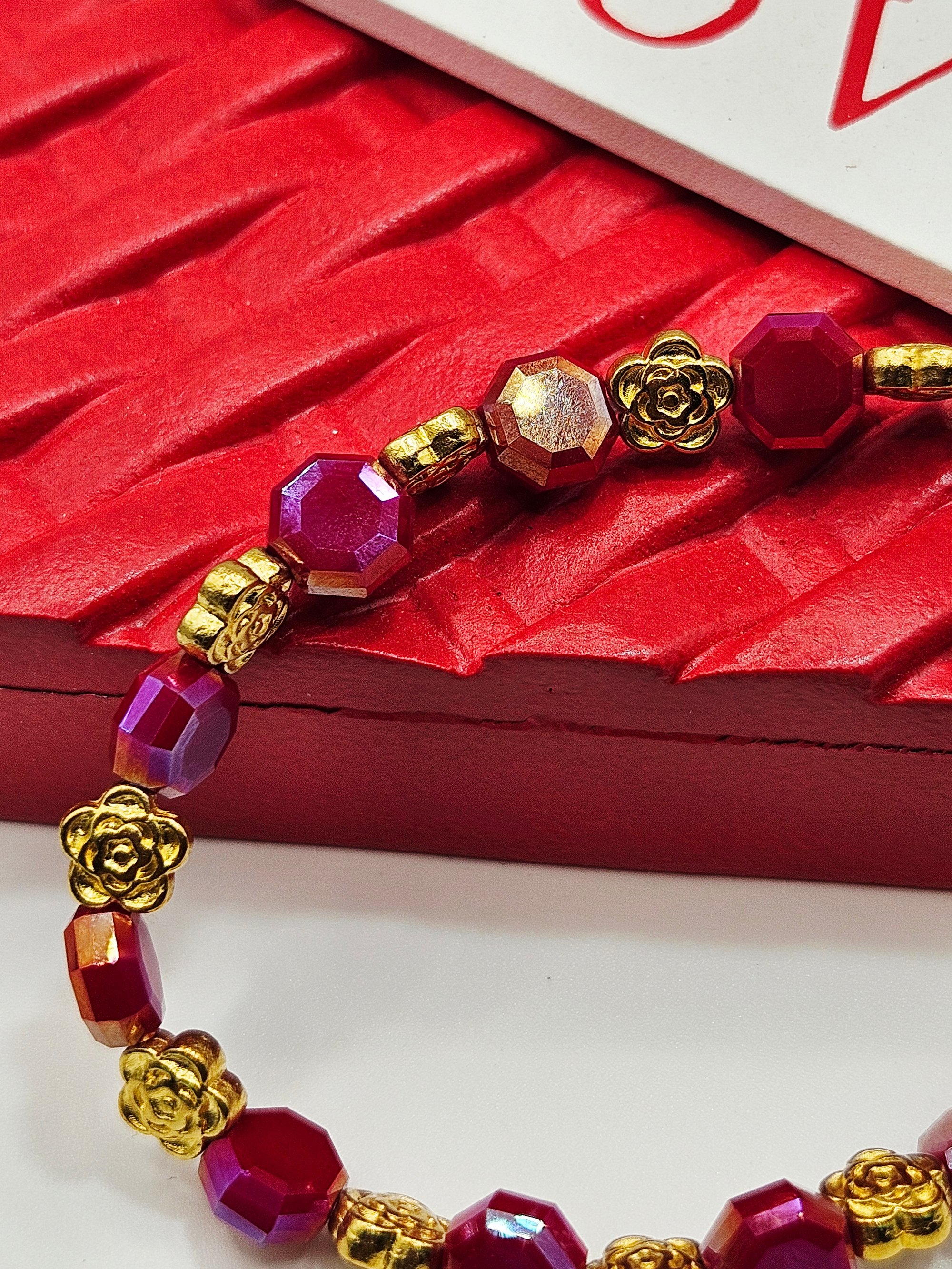 Hexagon glass beads with a AB finish, gold metal flower spacer beads and a gold metal charm.