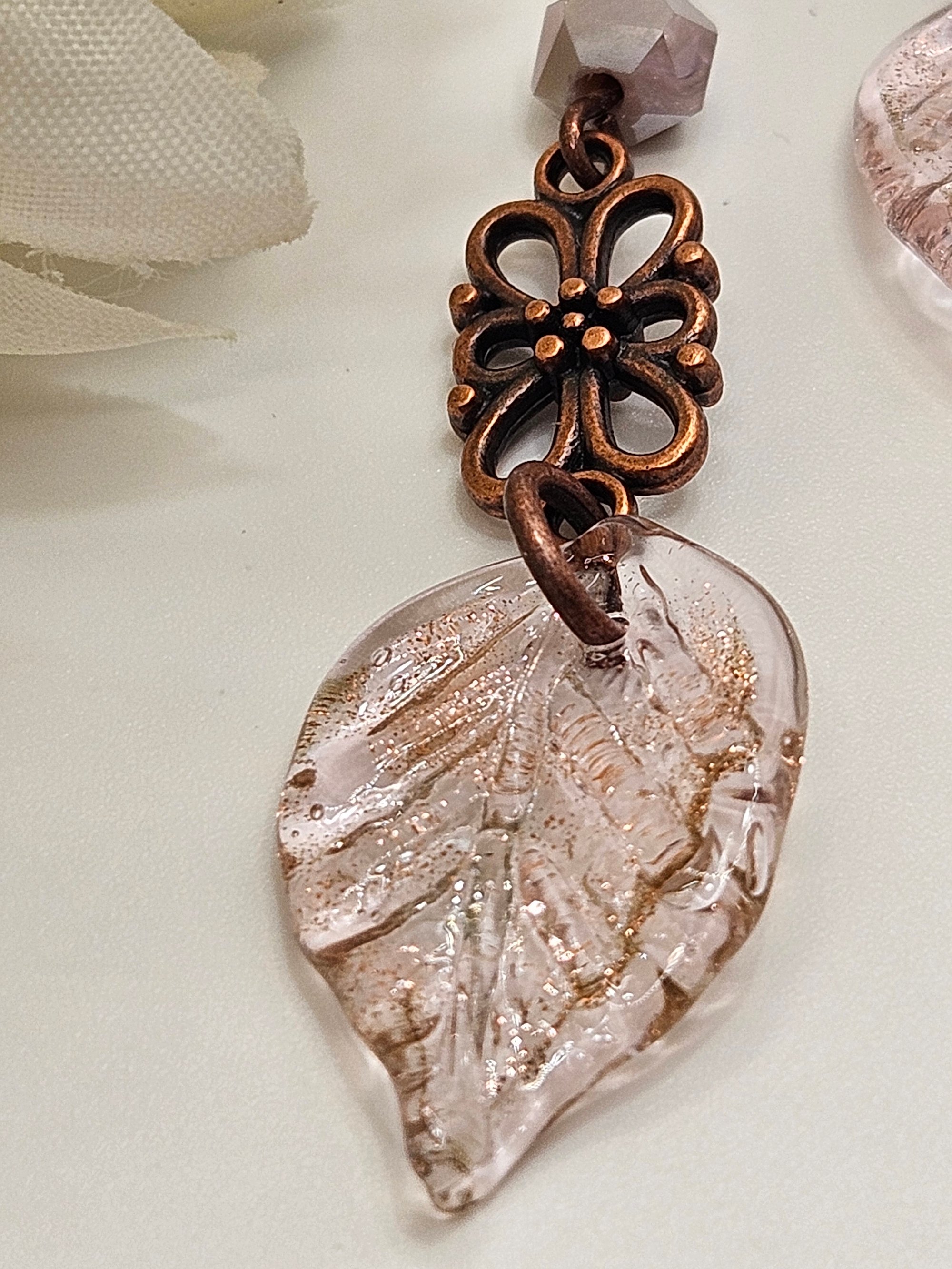 Antique copper floral links, lavender faceted crystal bead with a lampwork glass leaf pendant.